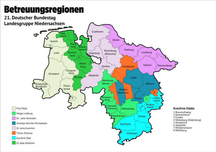 Teilnehmen können alle Bürger*innen aus dem Wahlkreis Oldenburg – Ammerland sowie meinen Betreuungsbieten Oldenburg Land, Vechta, Delmenhorst, Wesermarsch, Friesland, Wittmund, Wilhelmshaven. In der unteren Abbildung könnt ich sehen, wer für euren Wahlkreis zuständig ist. Vorkenntnisse sind nicht erforderlich.